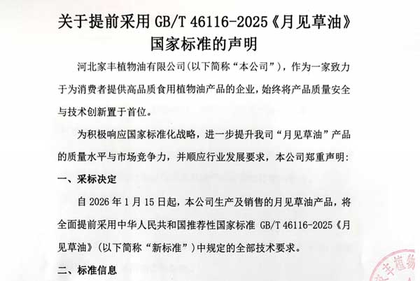 关于提前采用 GB/T 46116-2025《月见草油》国家标准的声明